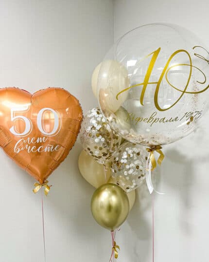 Одним из самых популярных вариантов являются шары с надписями, например, «Счастье вам!» или «Годы вместе». Также очень эффектно смотрятся шары с сердечками или шары в форме свадебных колец.